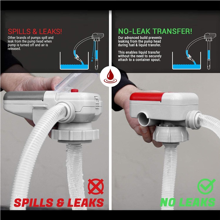 1. Pump Head Air Breakage Removed to Prevent Any Fuel Spills! Longer Dischage Hose ( 25 to 35 inch ) Fuel from greater distances