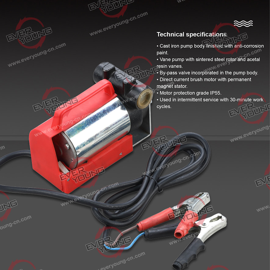 Displacement, self-priming, rotary electric vane pumps for the transfer of diesel fuel equipped with by-pass valve. Powerful, dependable and economical, they are available with 12 and 24-volt direct current motors.