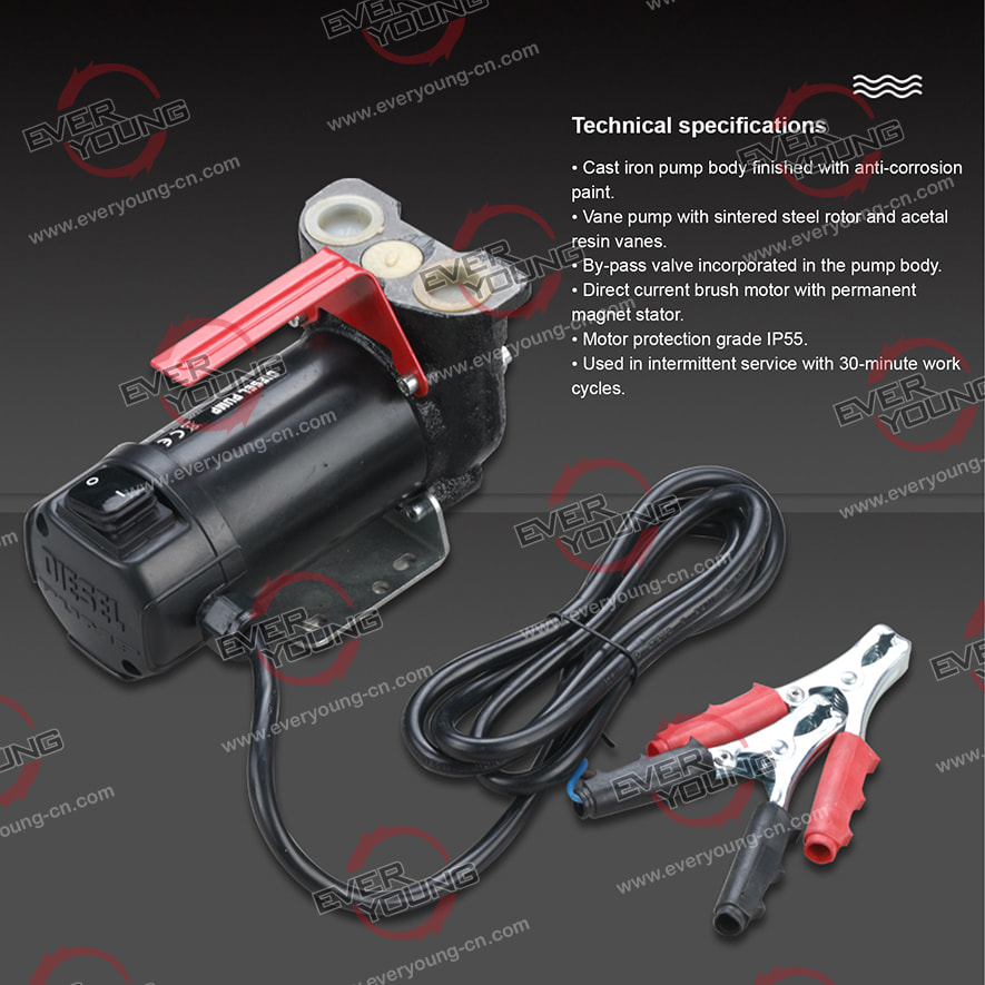 Displacement, self-priming, rotary electric vane pumps for the transfer of diesel fuel equipped with by-pass valve. Powerful, dependable and economical, they are available with 12 and 24-volt direct current motors.